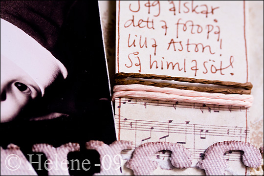 Och så en närbild på en bit av tagen. Jag har satt på en bit rivet notpapper från Ladybug & Friends och sen lite tuffa snören. Blev urläckert irl! Man ser även att jag chalkat lite på tygbokstäverna, för att tona ner det vita lite...