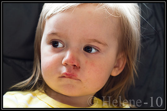 Stackars lilla Bus!! På ett litet kick råkar han snubbla på en liten asfaltsknöl och faller rakt ner i asfalten med ansiktet före, utan att ta i med händerna. Det resulterade i en massa grus och blod, en fläskläpp utan dess like och skrubbad näsa. Usch, han grät länge och väl, det måste gjort hur ont som helst. En massa kramar och tröst och en isglass senare så är han på bättre humör. Hoppas det läker fort nu!!